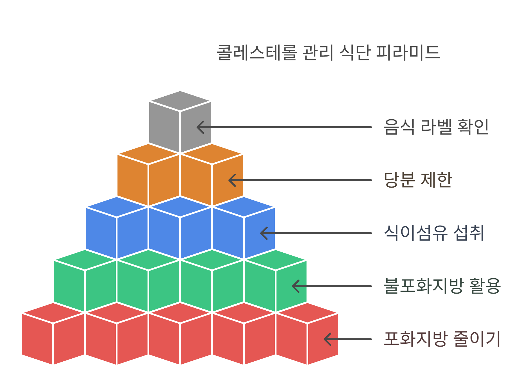 - 스트레스 관리만성 스트레스는 호르몬 교란으로 콜레스테롤 대사를 저해할 수 있어요. 명상이나 가벼운 산책이 도움 됩니다.