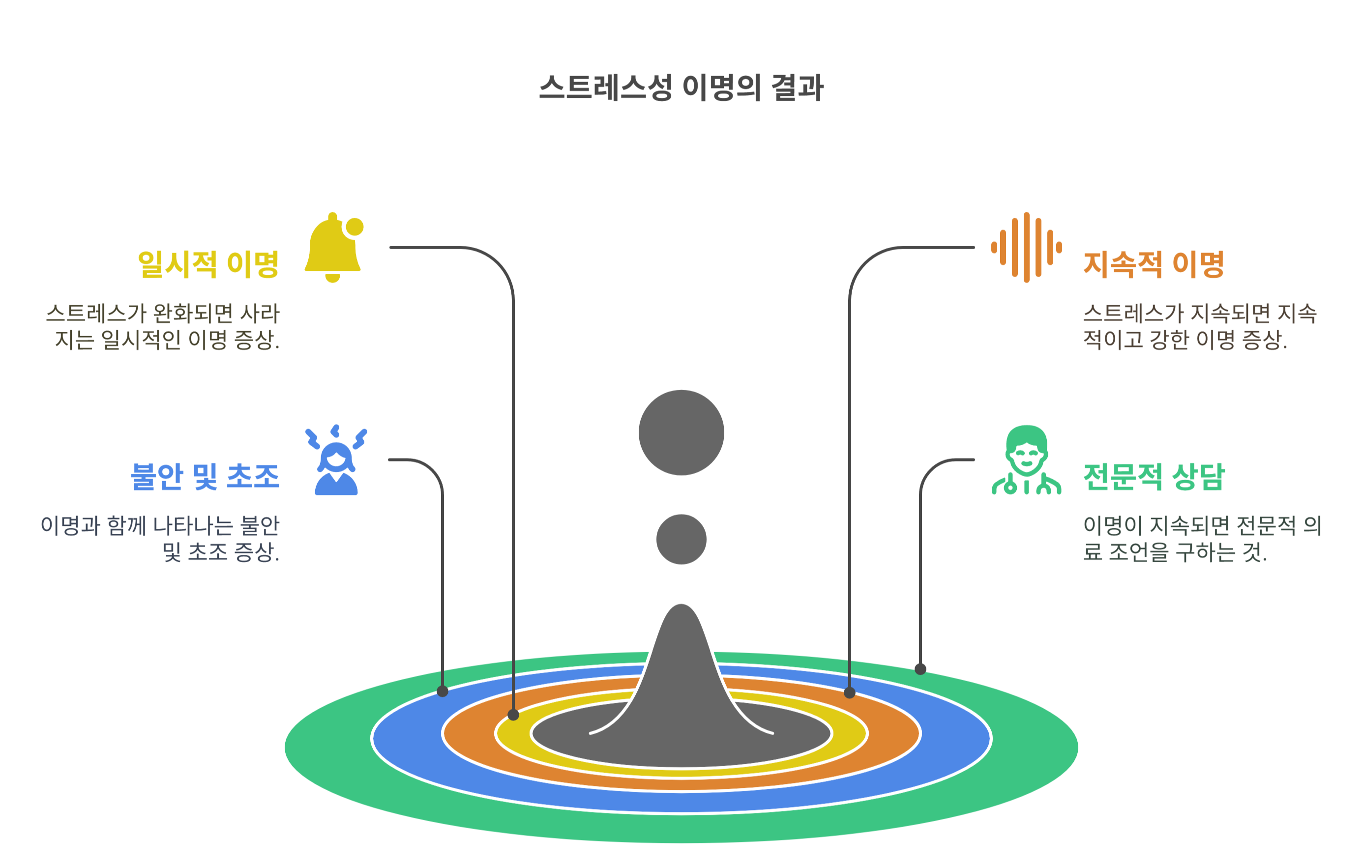 ⚠️ 주의: 스트레스를 완화하는 것이 중요하지만, 만약 이명이 지속된다면 이비인후과 및 신경과 전문의의 상담을 받아보세요.