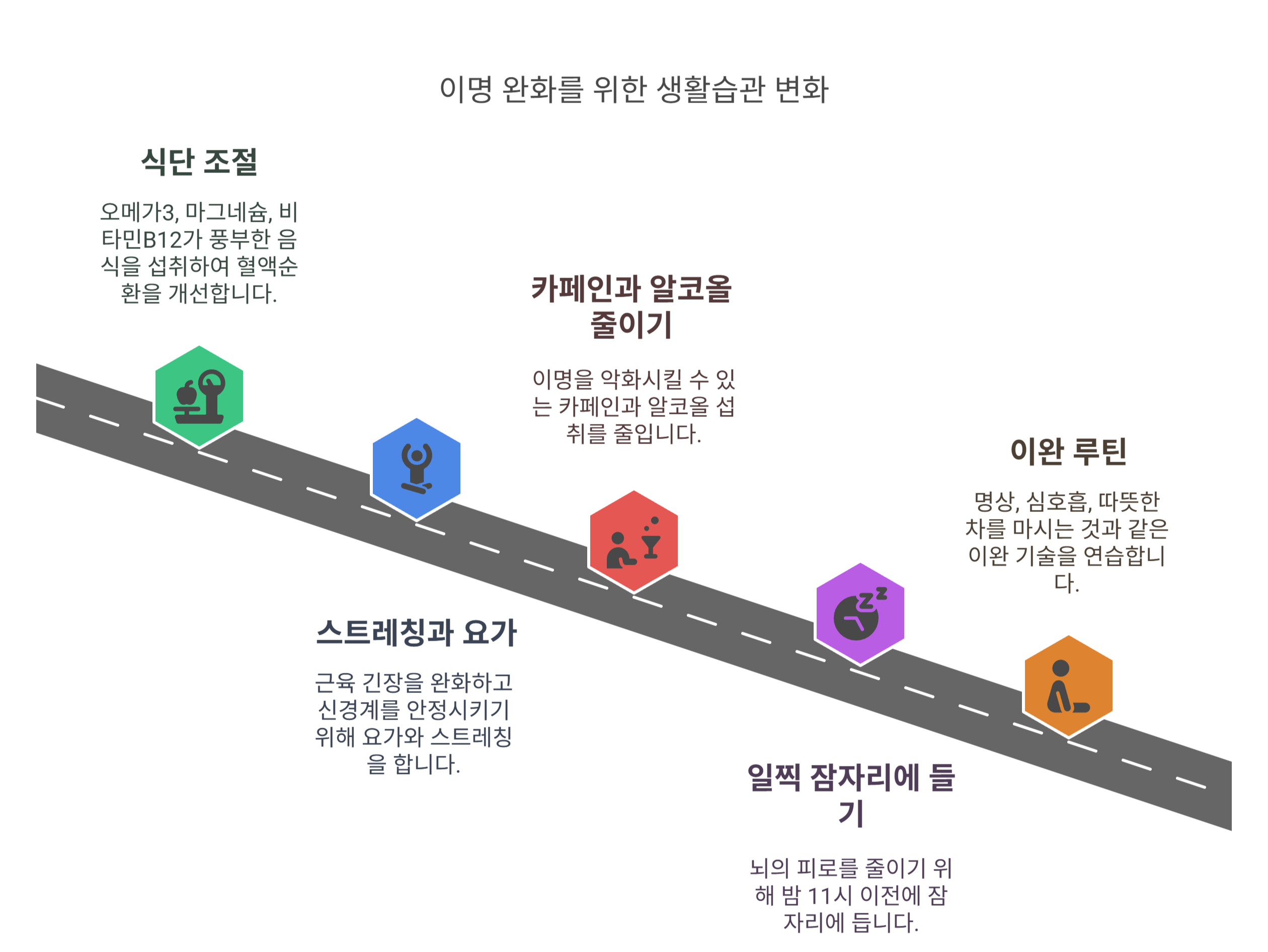 충분한 수면, 소음 피하기, 카페인 줄이기, 스트레칭 등을 실천해보세요. 일상의 작은 실천이 큰 도움이 됩니다.