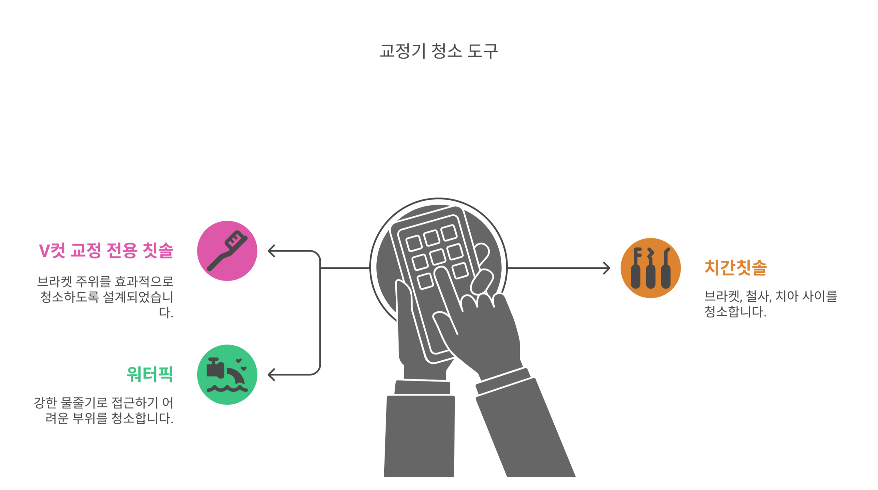 대한치과위생사협회도 교정기 사용 시 치간칫솔과 워터픽 등 보조도구 사용을 권장하고 있어요.