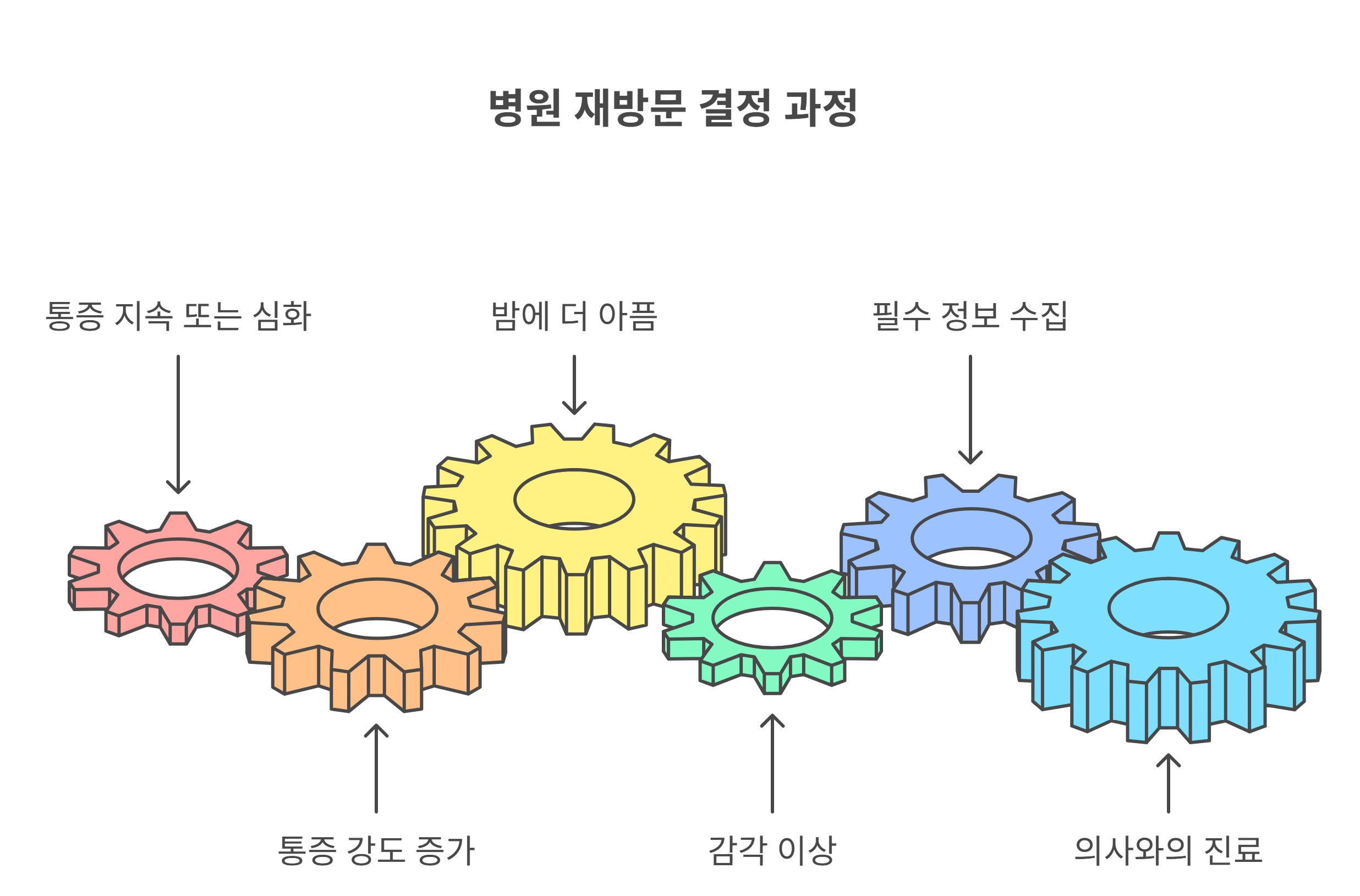 오늘은 단순 근육통이라 들었지만, 통증이 계속되거나 악화될 때 확인해야 할 체크포인트와 병원 재방문 시점에 대해 꼼꼼히 알려드릴게요!