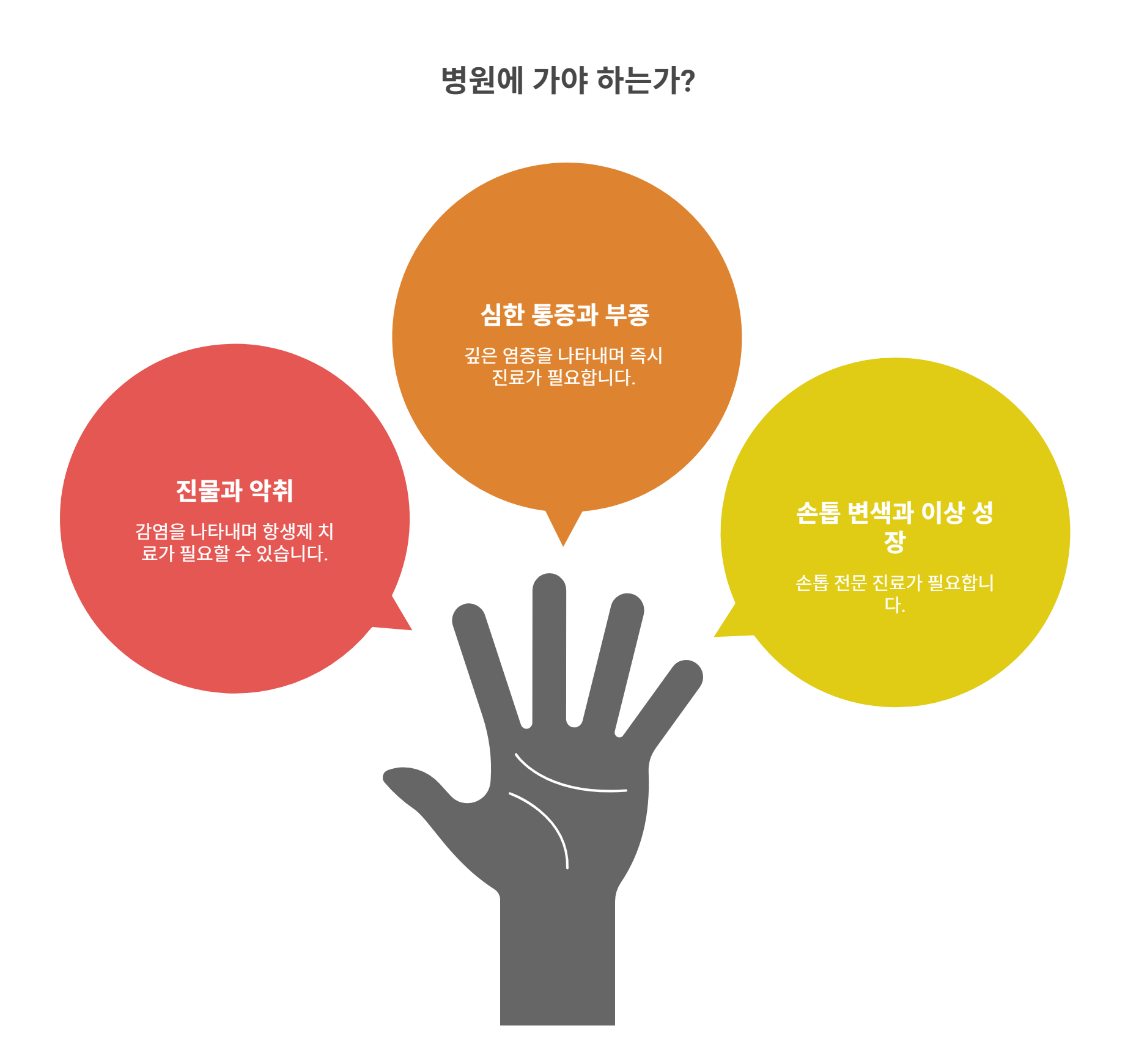 통증이 점점 심해지고 손가락이 붓는다면 염증이 깊게 진행된 신호일 수 있습니다. 방치하면 손톱 탈락이나 전신 감염(패혈증)으로 번질 수 있으니 즉시 진료가 필요합니다.