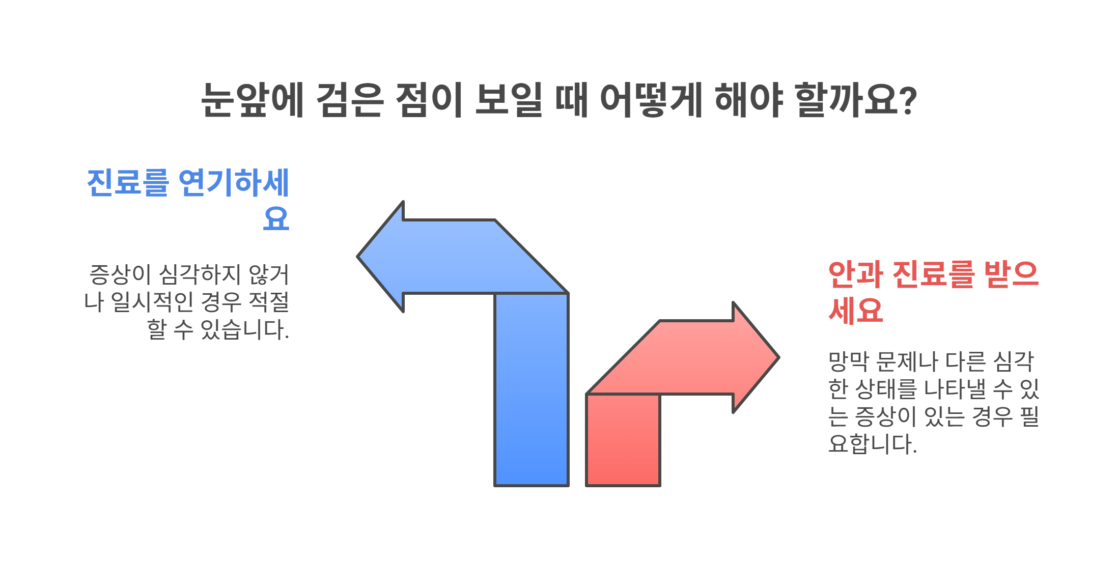 눈앞에 보이는 검은 점이 모두 위험한 건 아니지만, 다음과 같은 증상이 있다면 반드시 안과 진료를 받아야 합니다.
