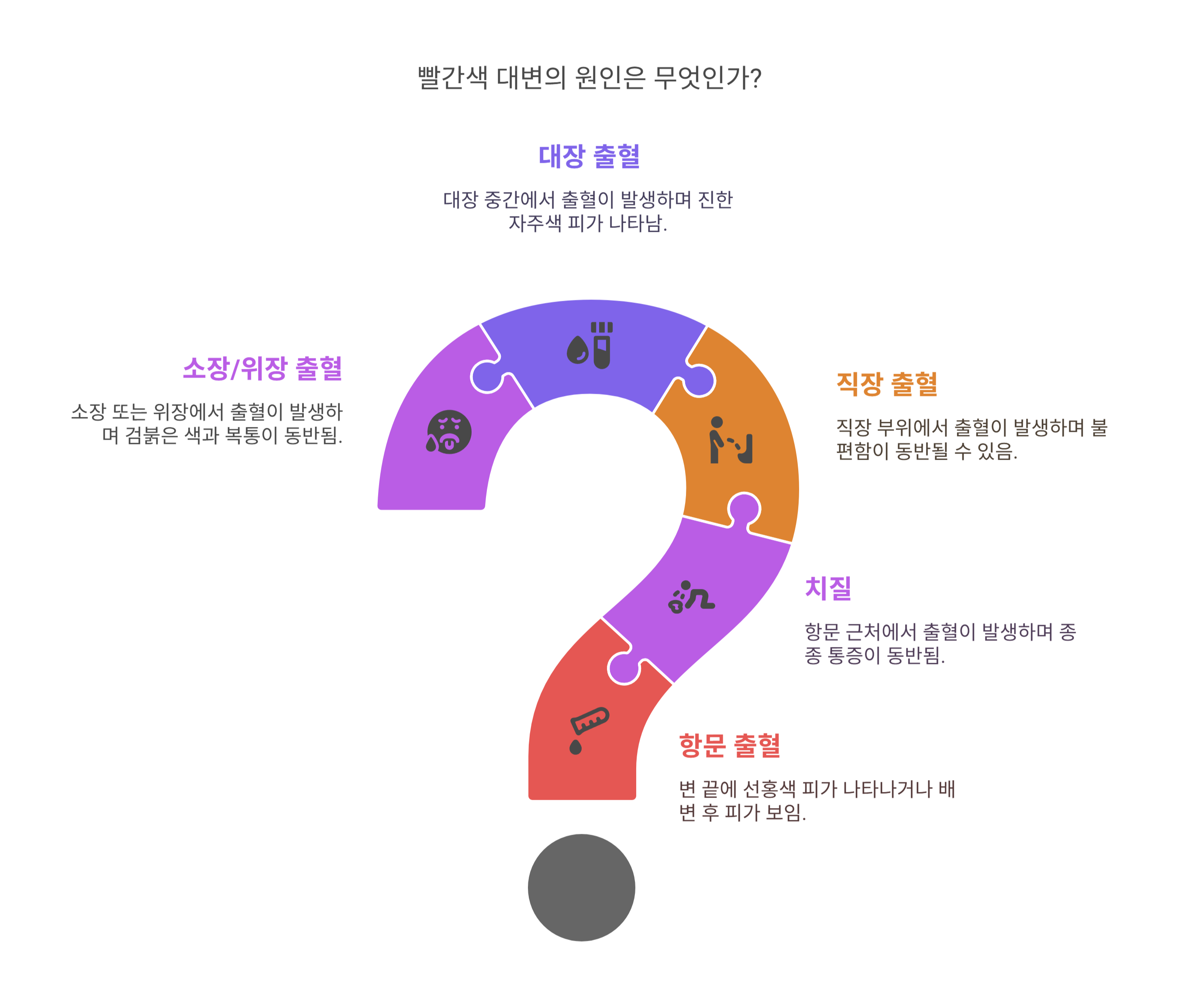 빨간색 대변은 흔히 항문 출혈, 치질, 또는 직장 출혈을 의미할 수 있어요.