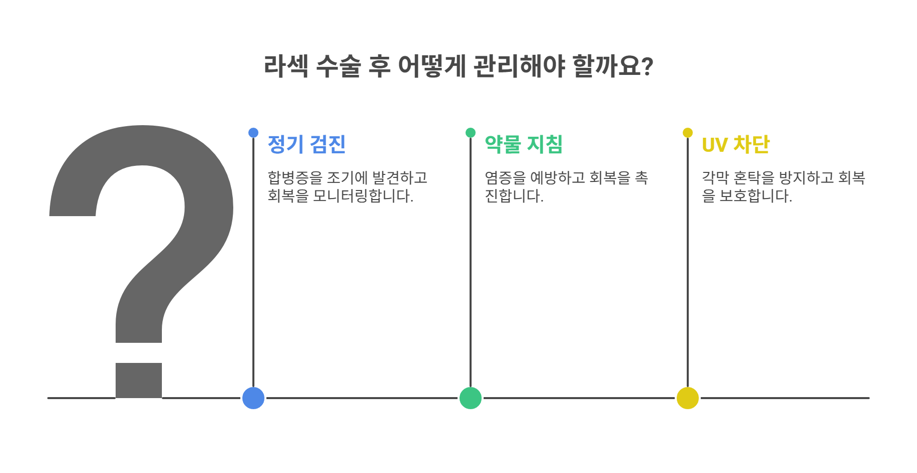 라섹 수술 후 1주, 1개월, 3개월, 6개월 단위로 진행되는 정기 검진은 필수입니다. 이 검진을 통해 각막 회복 상태, 시력 변화를 점검하고 합병증 여부를 조기에 발견할 수 있습니다.