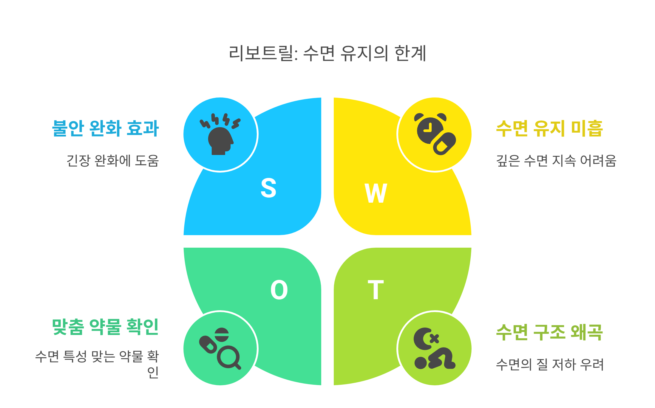 특히 리보트릴은 렘수면 억제 효과가 있을 수 있어, 수면 구조를 왜곡하거나 수면의 질이 낮아지는 문제도 동반할 수 있어요.
