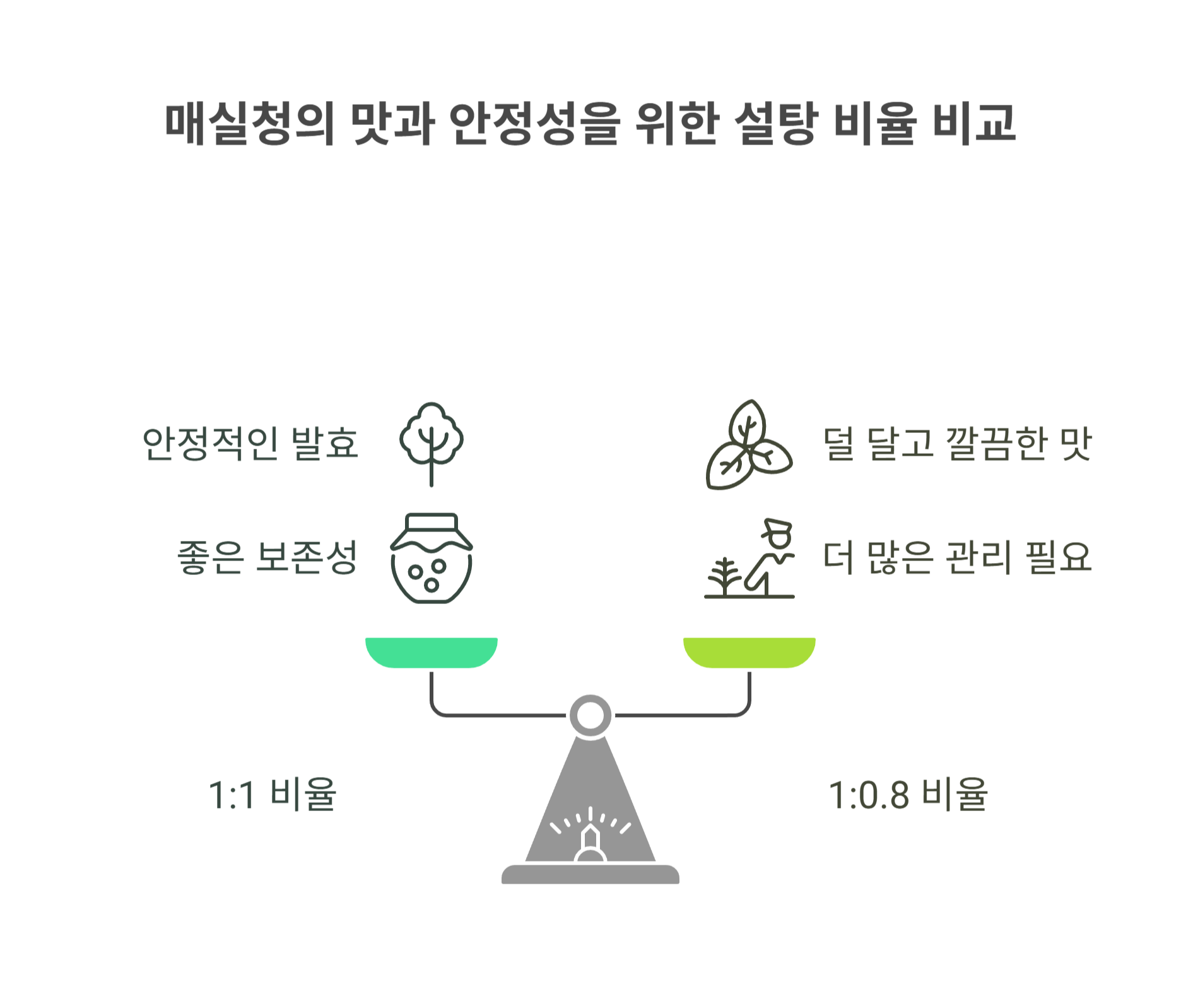 비율 1:0.8로 만들면 덜 달고 깔끔한 맛이지만, 숙성 관리에 더 신경 써야 해요.
