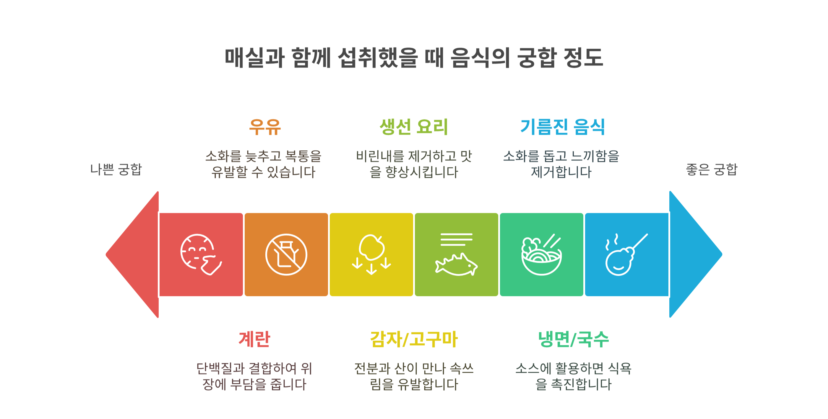 | 궁합 Bad | 계란, 우유, 감자/고구마 | 소화 저해, 위장 부담, 속쓰림 가능 |