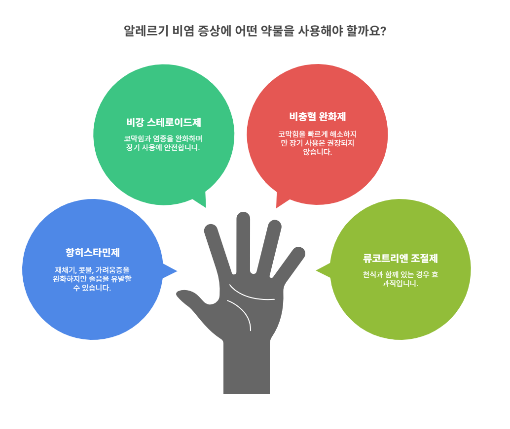 ⚠️ 주의: 약물은 증상을 완화하지만 원인을 없애지는 못합니다. 장기적 치료를 위해서는 면역치료도 고려해야 해요.