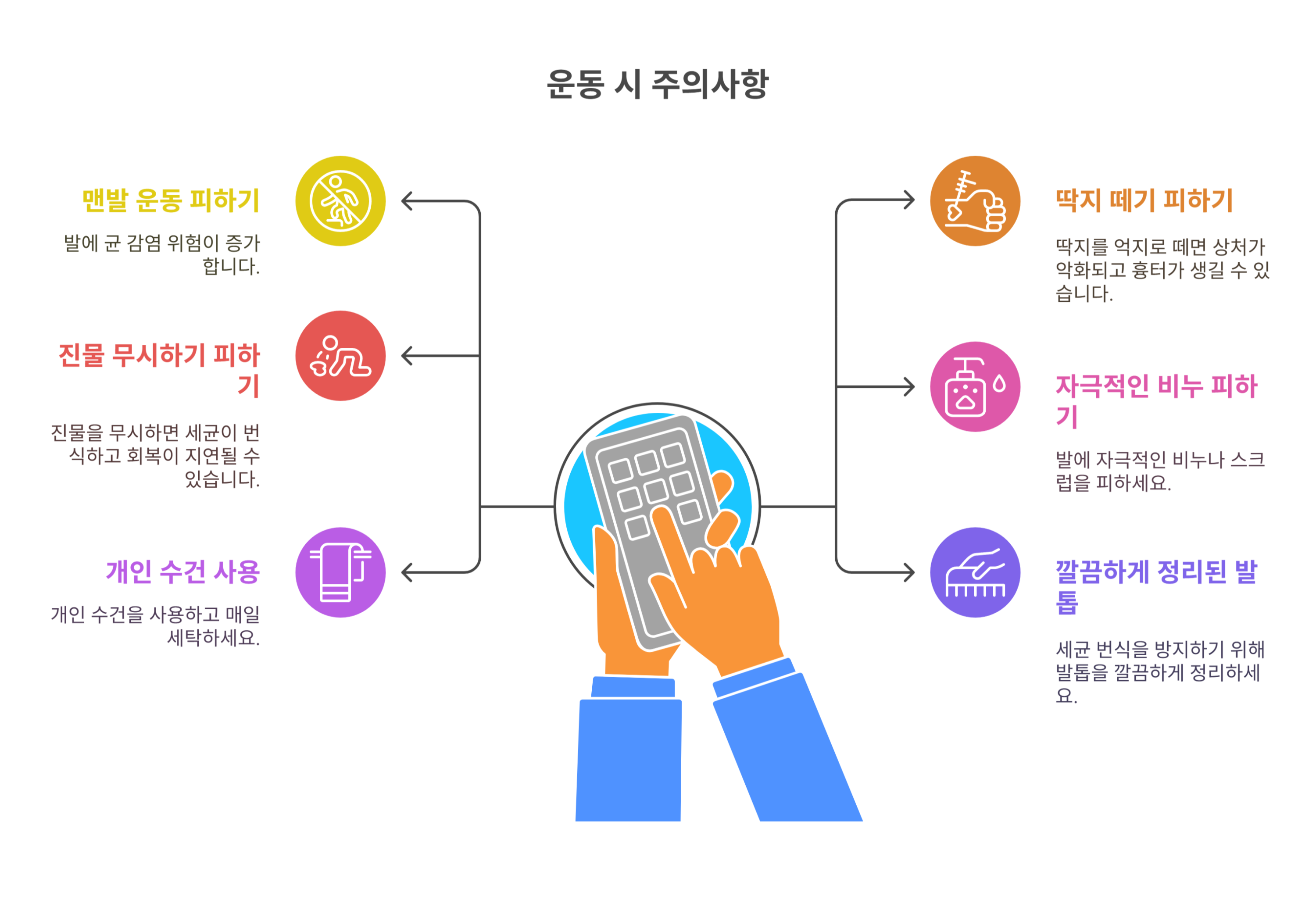 운동을 하게 되면 발바닥에 압력과 마찰이 가해지면서 치료 부위가 재손상되거나 세균 감염이 생길 수 있어요.