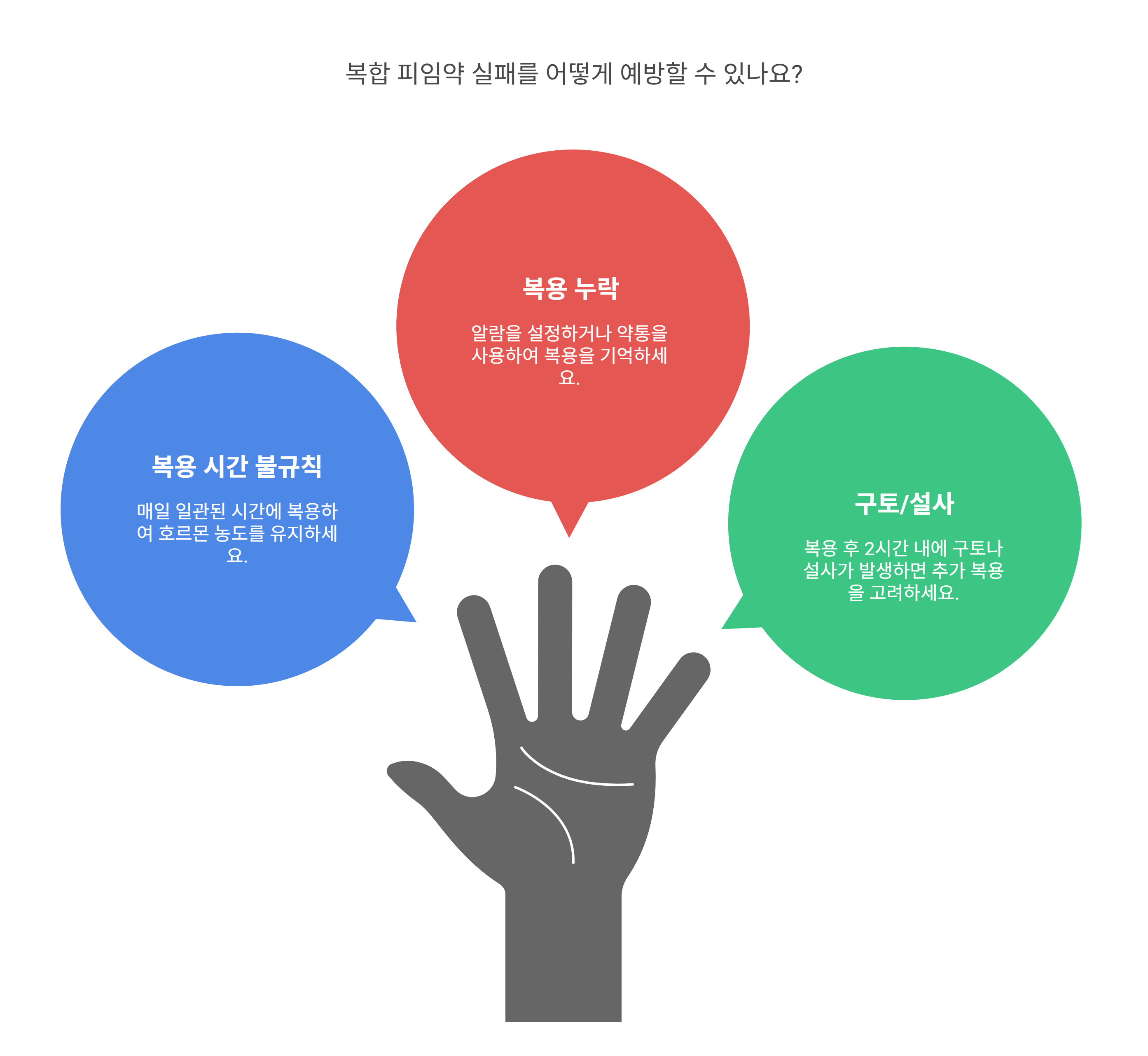 시간 놓침, 복용 누락, 구토나 설사 등 다양한 요인이 실패 원인이 될 수 있습니다.