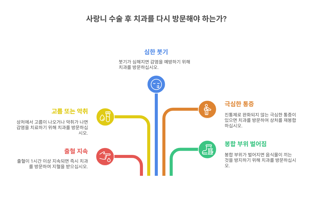 사랑니 수술 후 실밥이 풀리는 경우 대부분은 큰 문제가 없지만, 특정한 증상이 동반된다면 반드시 치과를 다시 방문해야 합니다. 회복이 지연되거나 감염으로 이어질 수 있기 때문이에요.