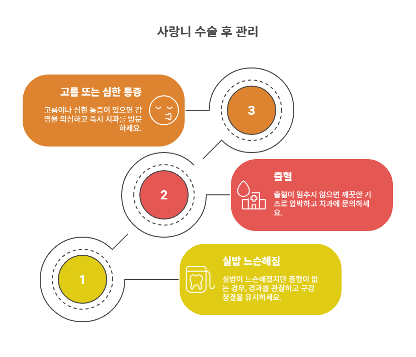 사랑니 수술 후 실밥이 풀렸을 때는 증상에 따라 대처법이 달라집니다. 단순히 실밥이 느슨해진 것인지, 아니면 출혈·감염 같은 응급 상황인지 구분하는 게 중요해요.