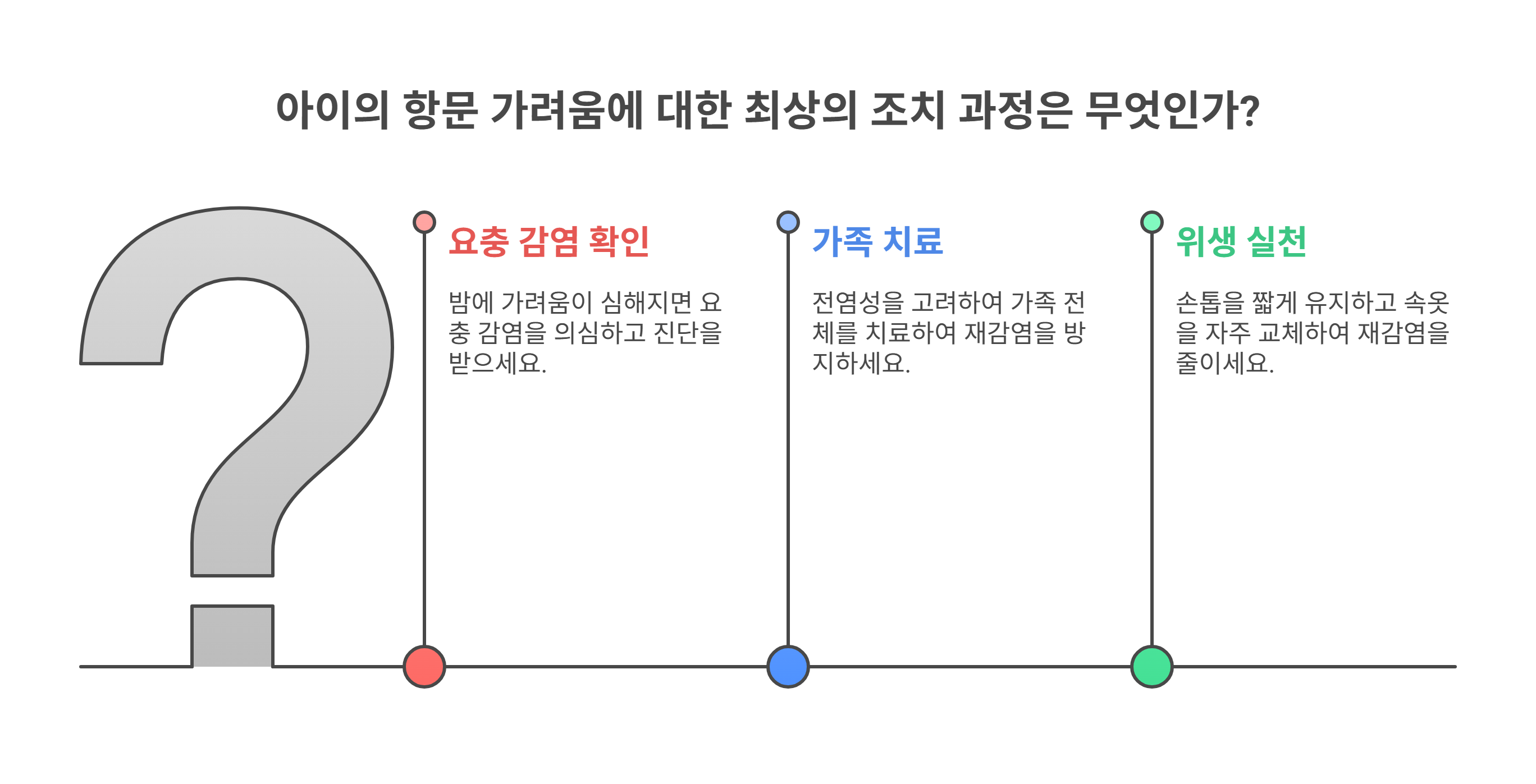 🩺 의사 TIP: 요충은 재감염률이 매우 높기 때문에 2주 간격으로 두 번 이상 약을 복용하고, 손톱 정리와 속옷 교체가 매우 중요해요.