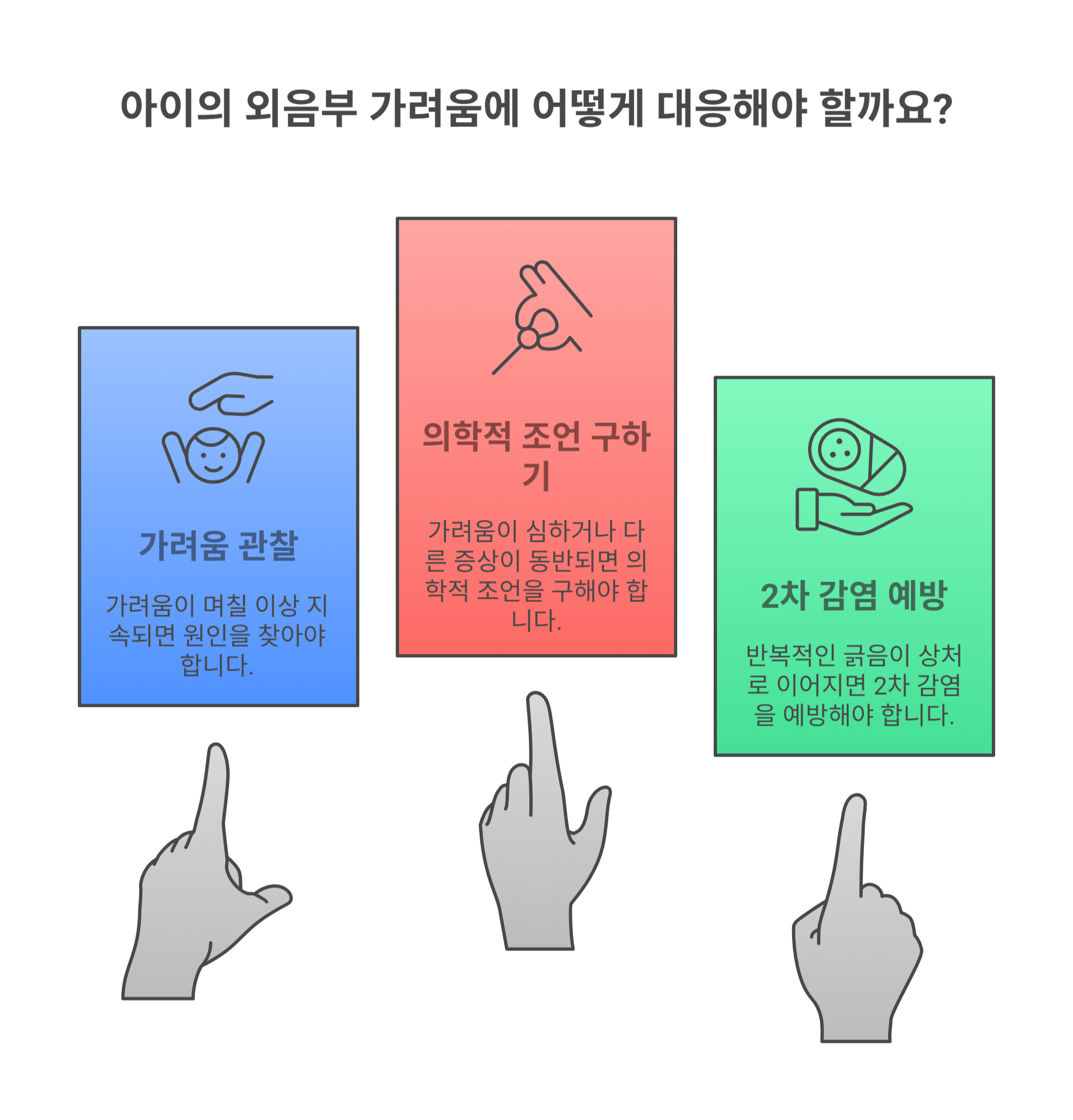 이때 부모의 세심한 관찰이 필요하며, 가려움이 며칠 이상 지속된다면 원인을 찾아야 해요.