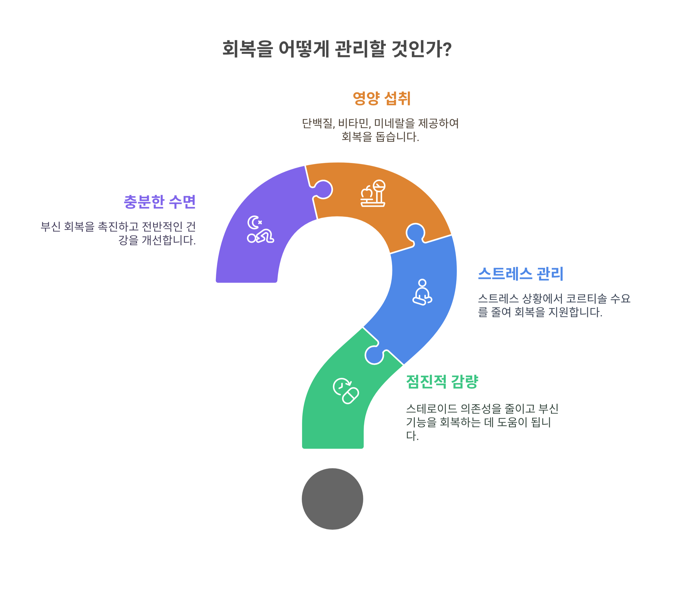 - 점진적 감량: 체내 스테로이드 의존성을 줄이며 부신 기능 회복 유도