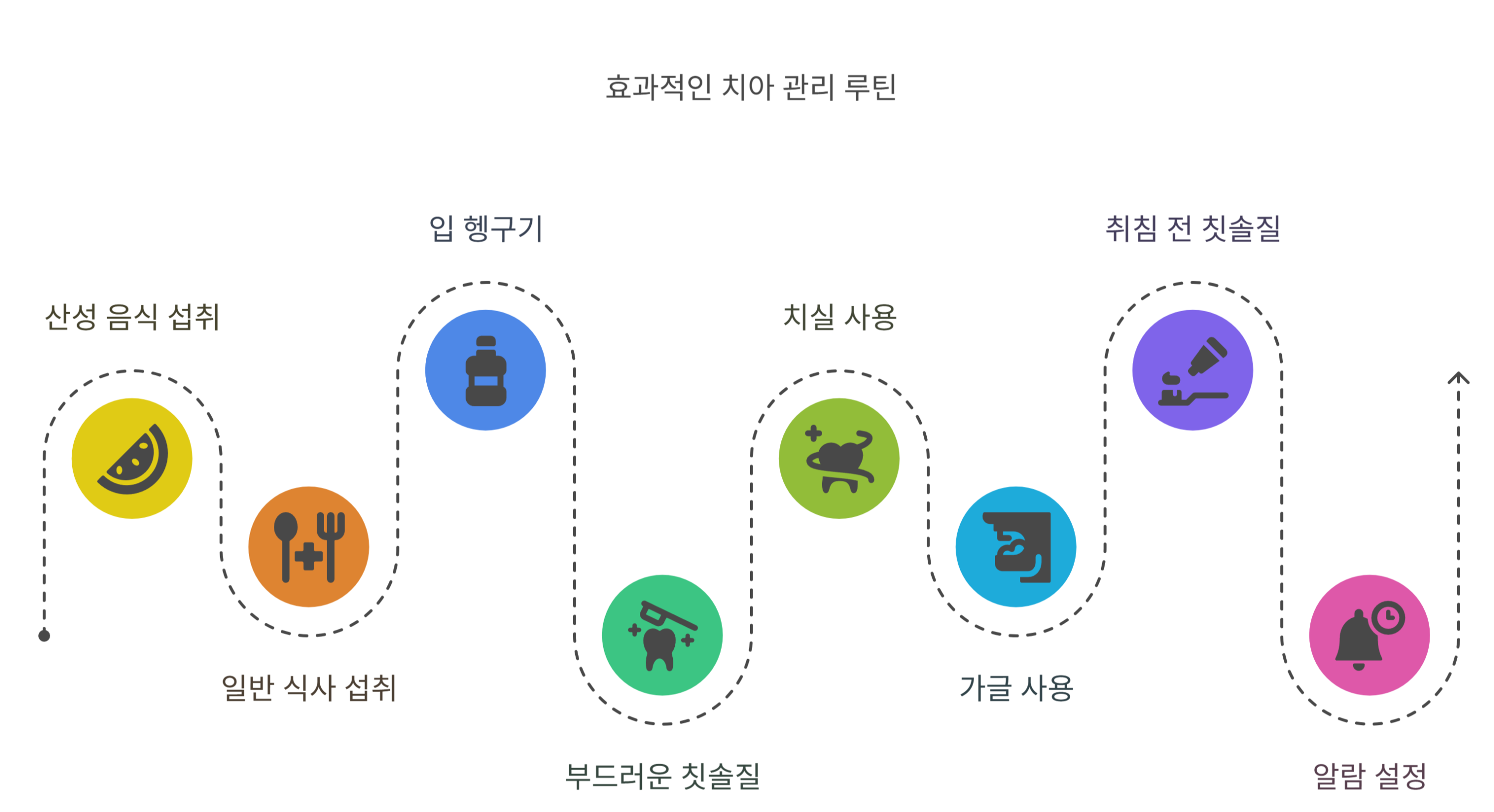 ⚠️ 주의: 산성 음식을 먹고 30분 이내에는 양치를 피하는 것이 좋아요!
