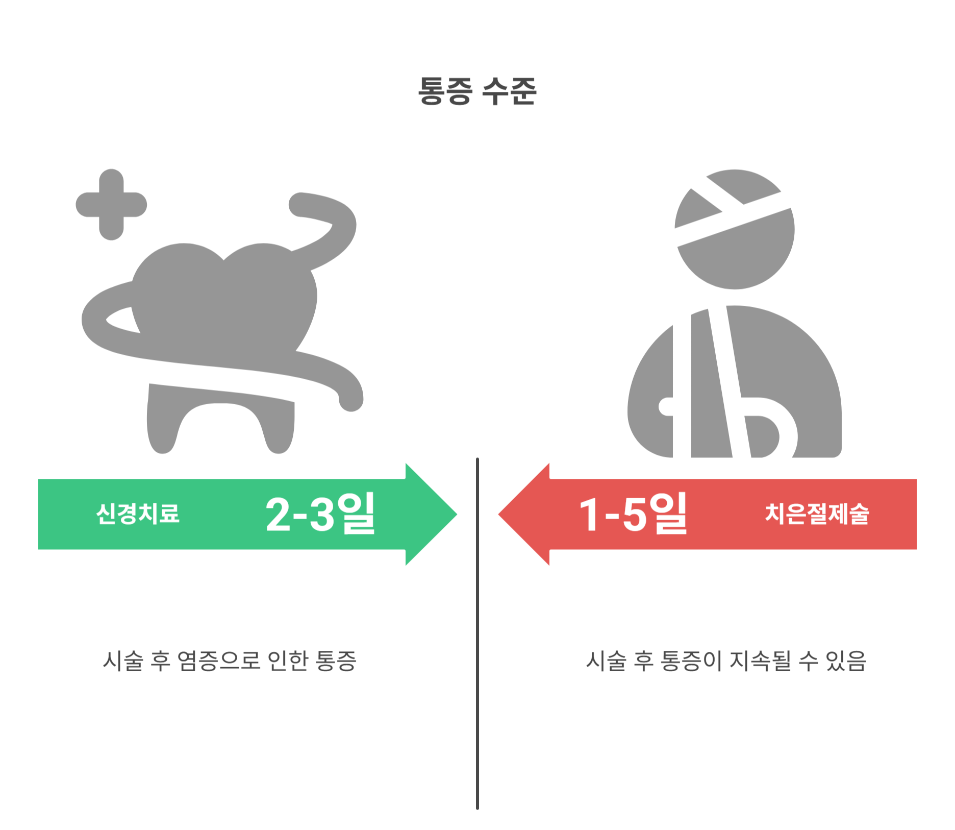 | 시술 후 통증 | 염증에 따라 2~3일 간 욱신거림 | 1~5일 통증 지속 가능 |