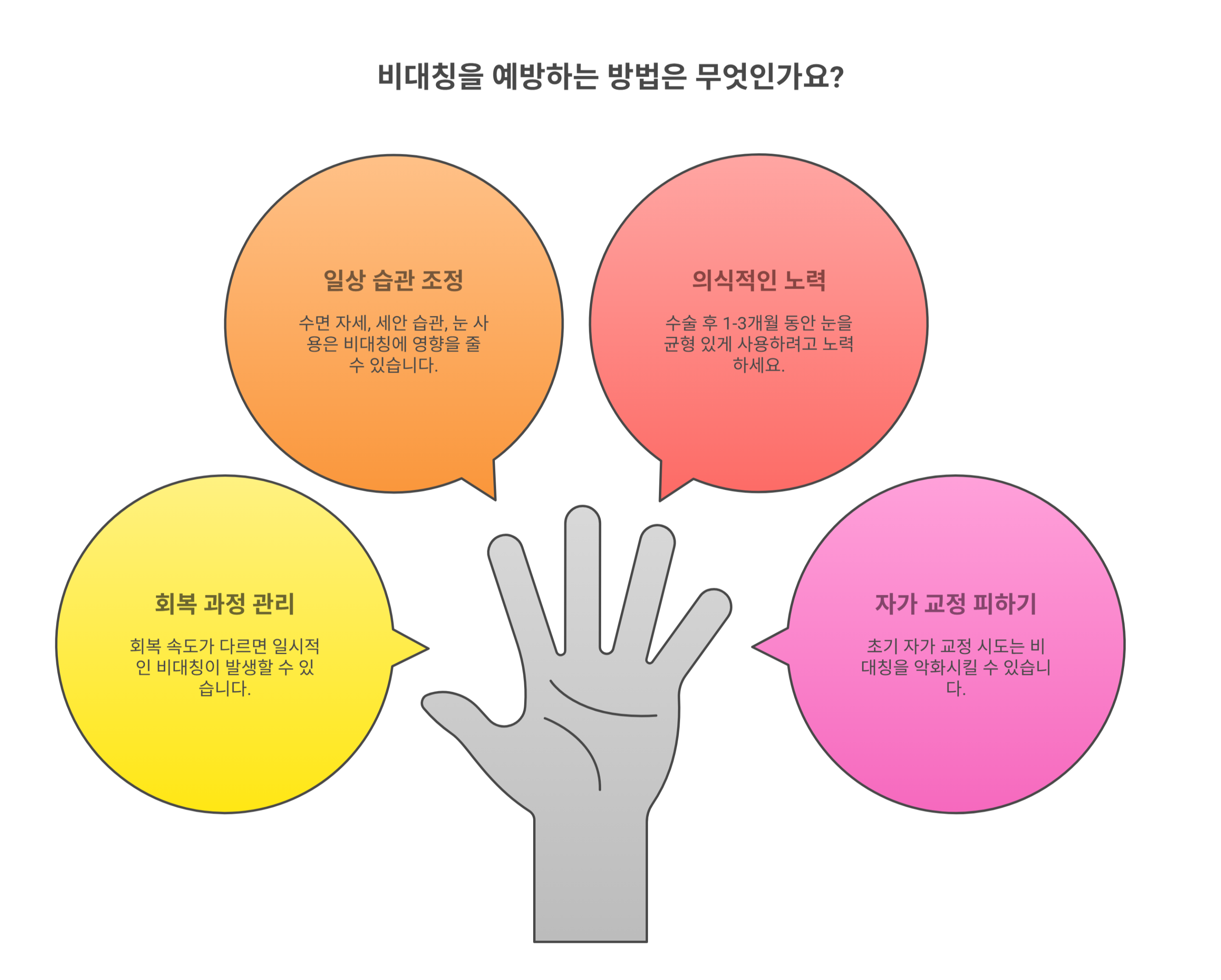 💡 TIP: 수술 후 1~3개월 동안은 좌우 눈을 최대한 균형 있게 사용하려고 의식적으로 노력해보세요!