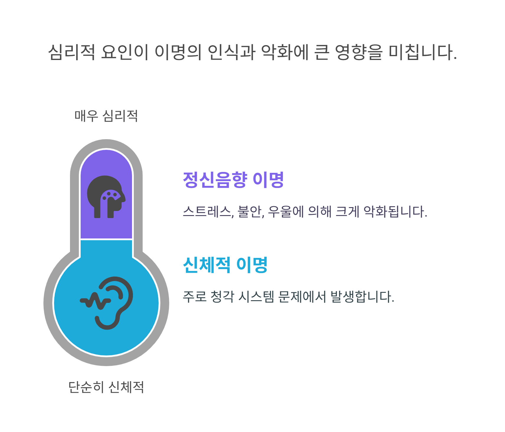 ⚠️ 주의: 이명을 무조건 약이나 물리치료로만 해결하려 하지 말고, 정신적 원인도 함께 고려해보세요.
