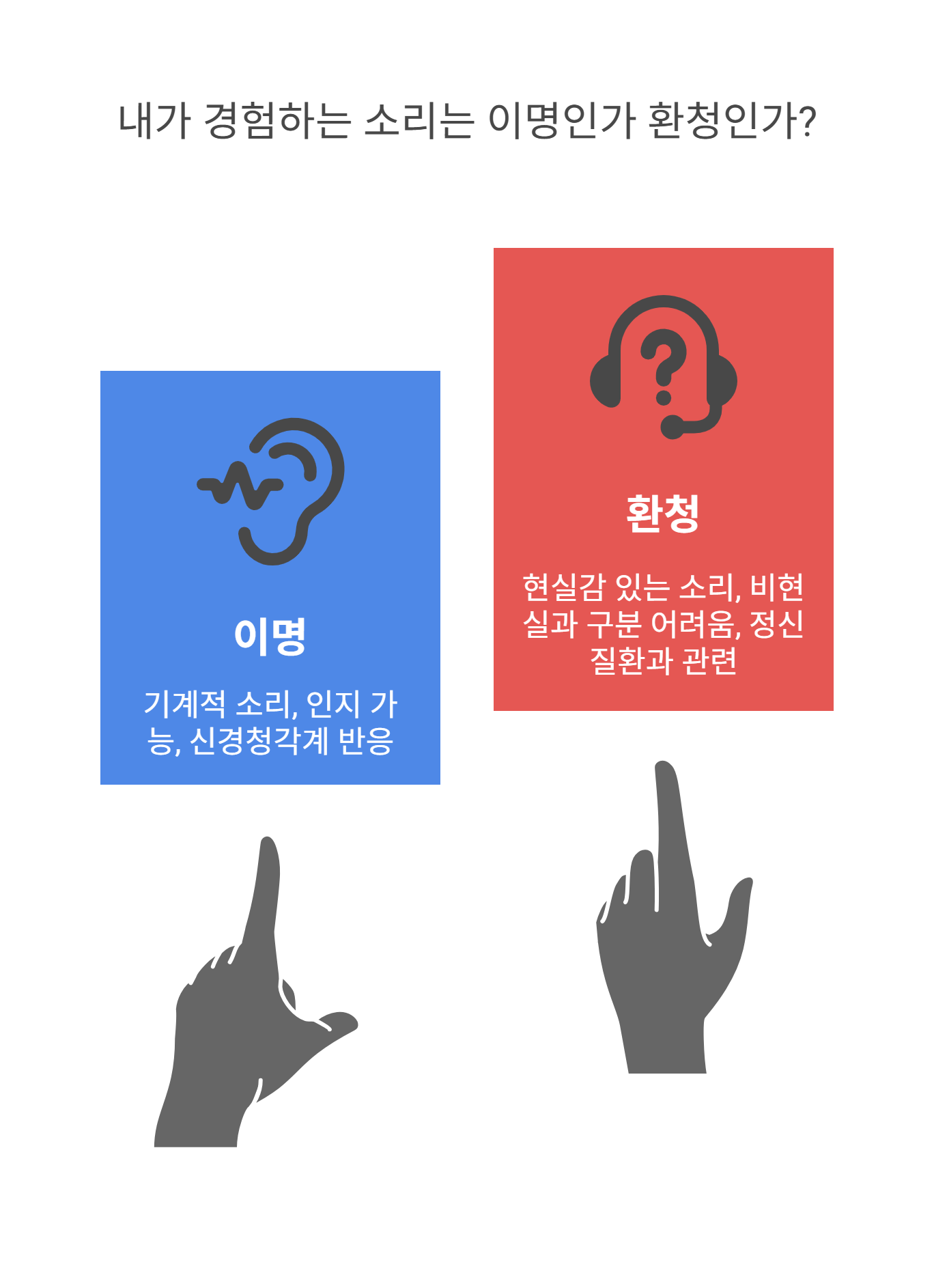 | 소리 유형 | 삐, 웅, 귀울림 등 기계적 | 사람 목소리, 대화 등 현실감 있는 소리 |