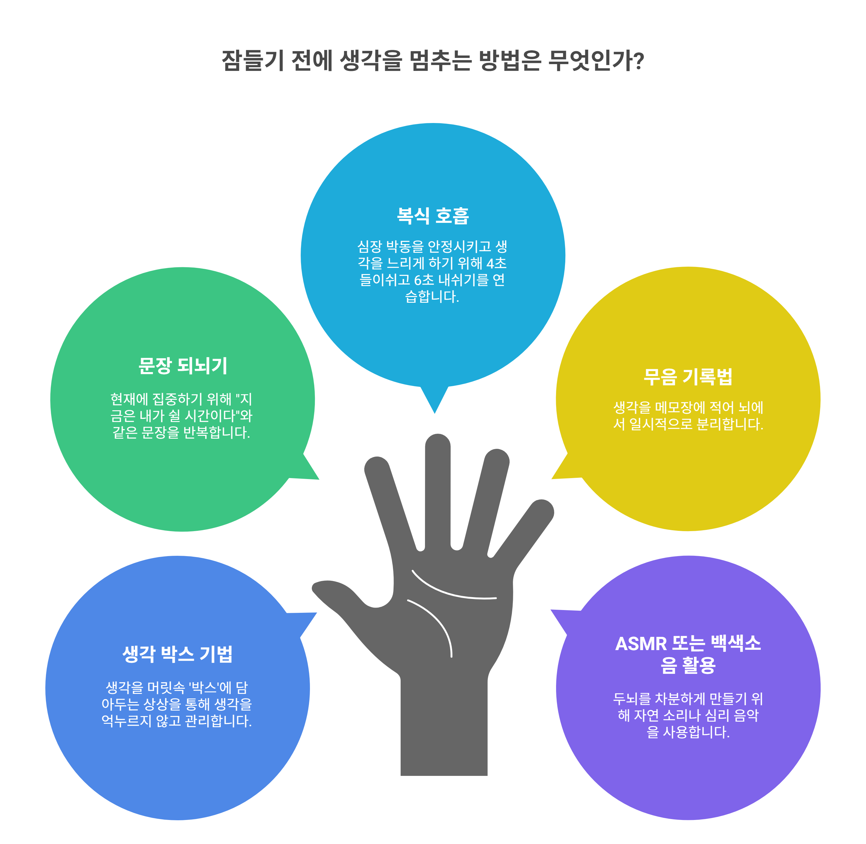 이제, 잠들기 전 생각을 멈추는 실전 방법들을 정리해볼게요! ☁️