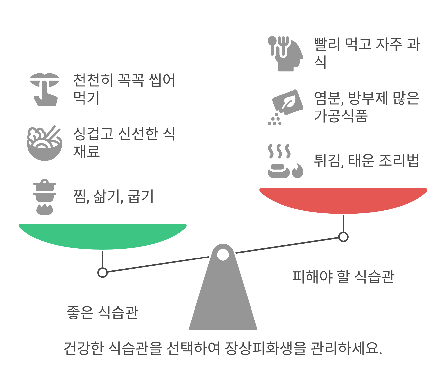 장상피화생은 어떤 음식을 먹느냐보다 어떻게 먹느냐가 더 중요합니다. 조리법과 식습관을 함께 바꿔야 효과를 볼 수 있어요.