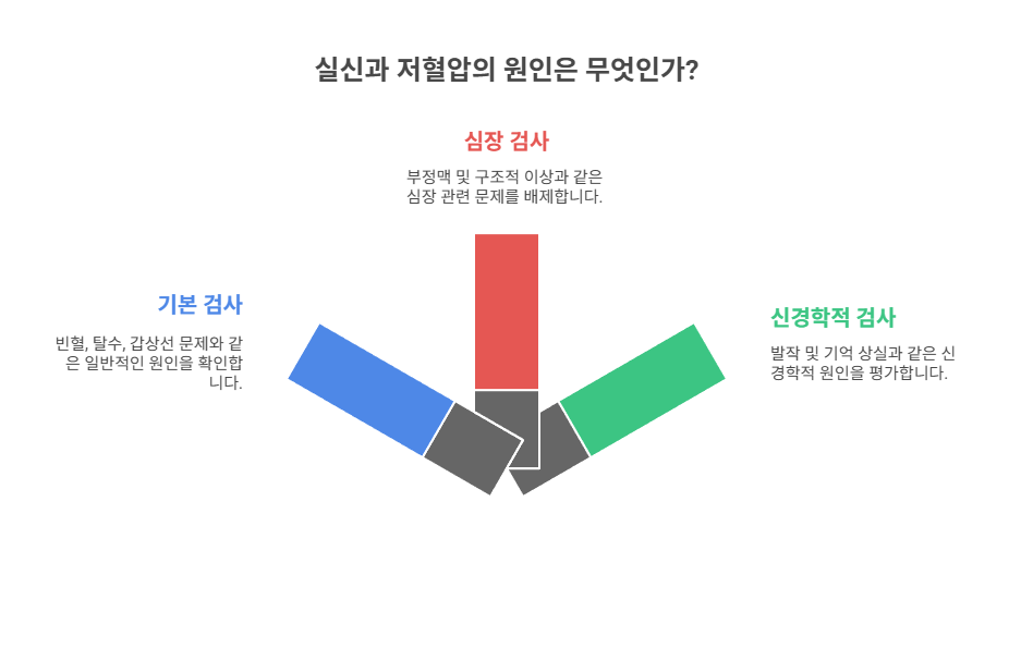 실신과 저혈압이 동시에 나타나면 심장 원인을 반드시 배제해야 합니다. 주요 검사는 다음과 같아요.