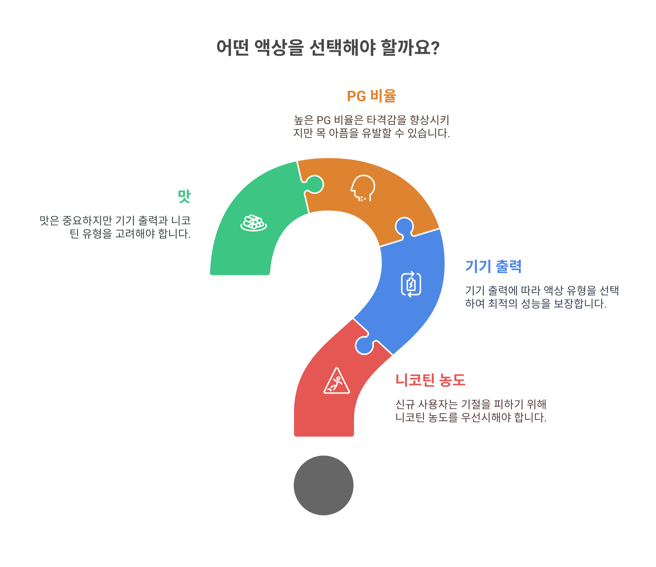- PG 비율 높은 액상은 타격감은 좋지만 목 아픔 유발 가능 → 적응 필요