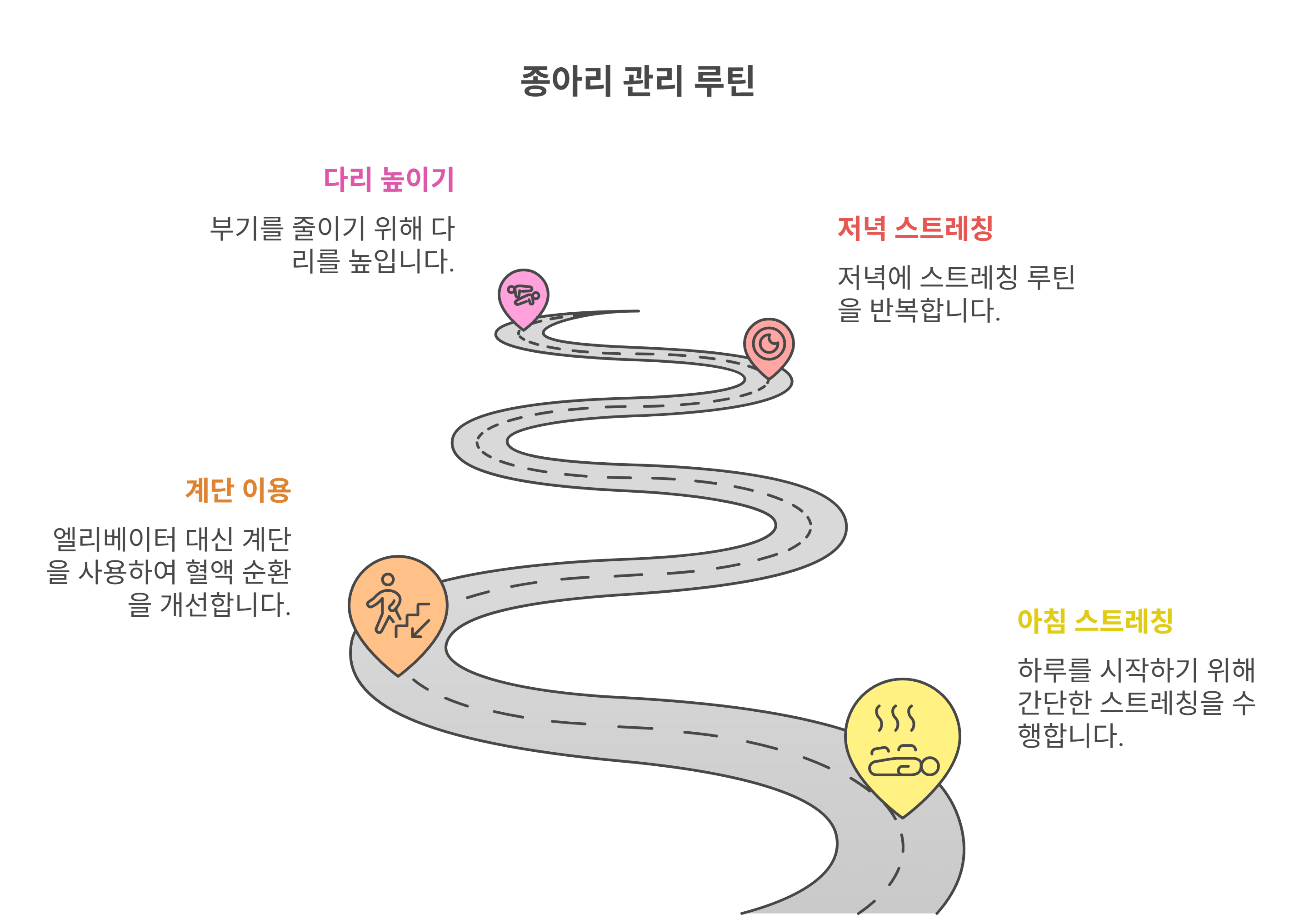 | 기상 직후 | 종아리 스트레칭, 발목 돌리기 |