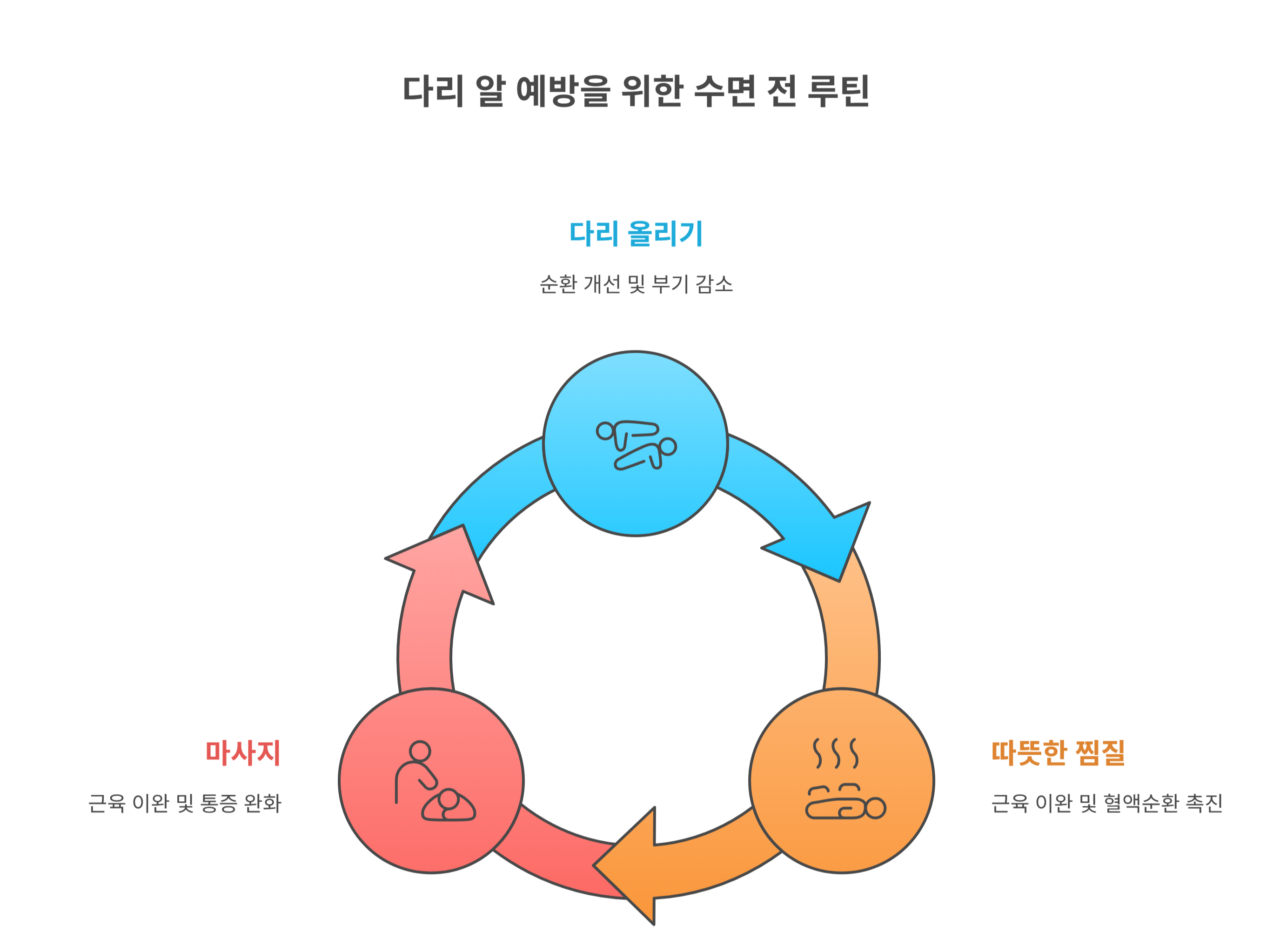 수면 전에 간단히 실천할 수 있는 루틴만 잘 챙겨도 다리 알 형성을 예방하고 부기를 줄이는 데 큰 도움이 됩니다.
