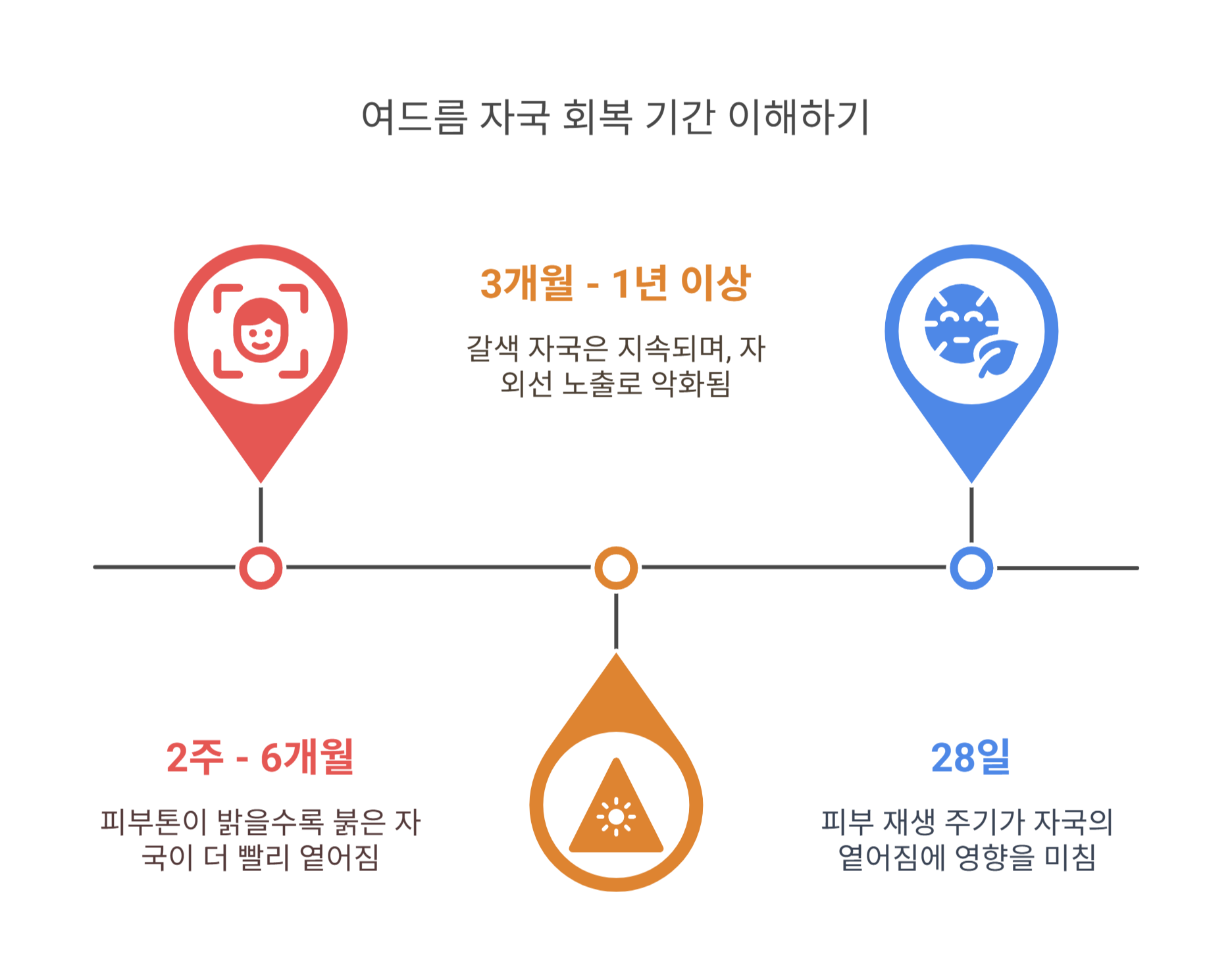 이 자국은 피부의 회복력에 따라 천천히 사라지지만, 자외선이나 잘못된 관리로 인해 더 오래 남을 수 있어요.