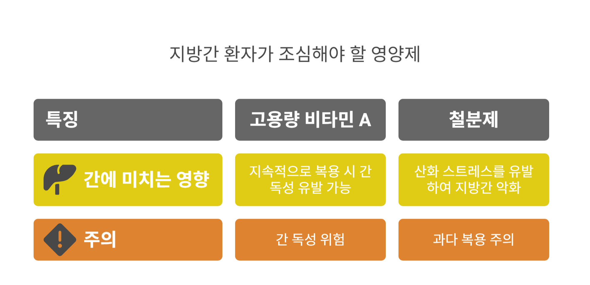 ✅ 고용량 비타민A, 철분은 간에 해로울 수 있어요.