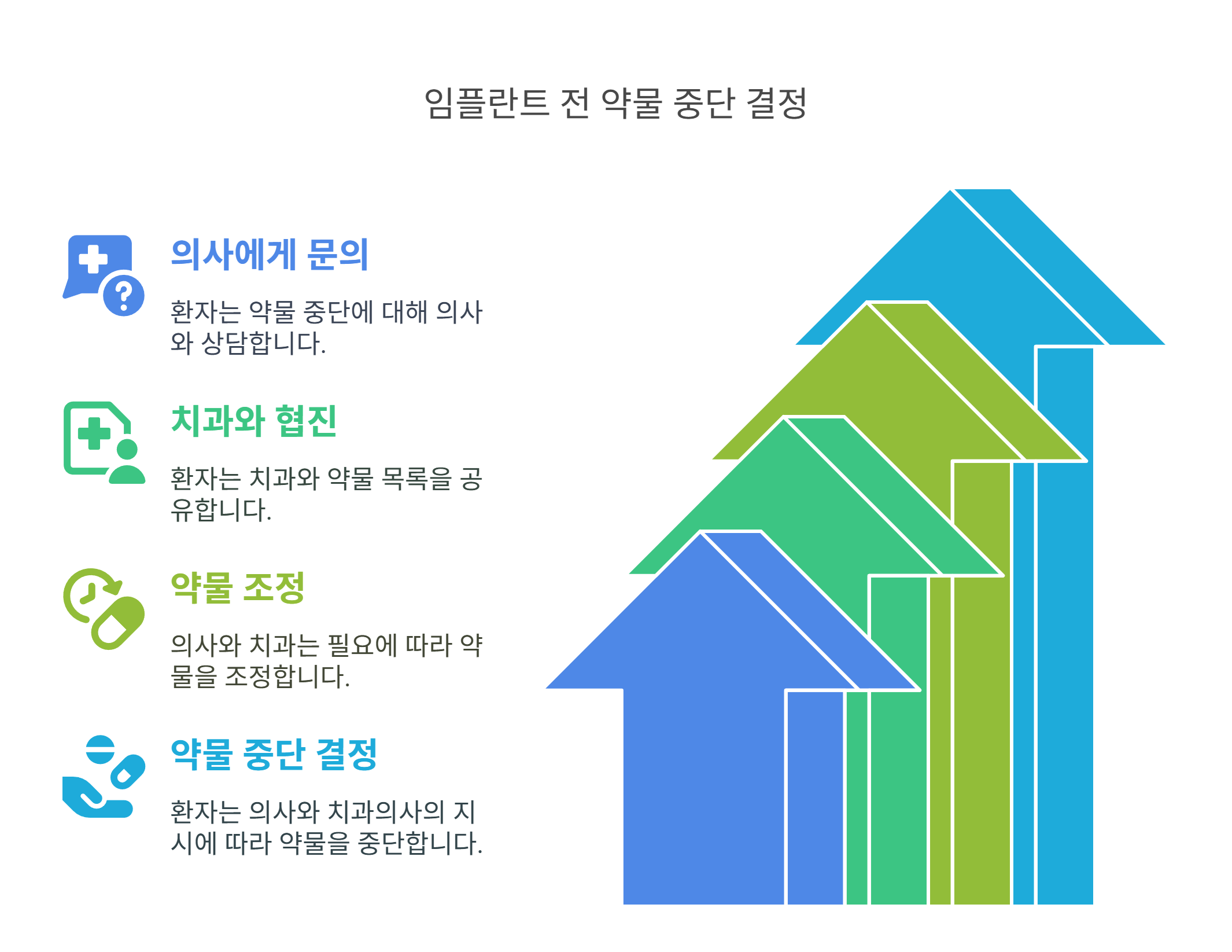 - 의료진 간 협진치과의사와 내과 주치의 간에 약물 중단 필요성 여부를 논의합니다.
