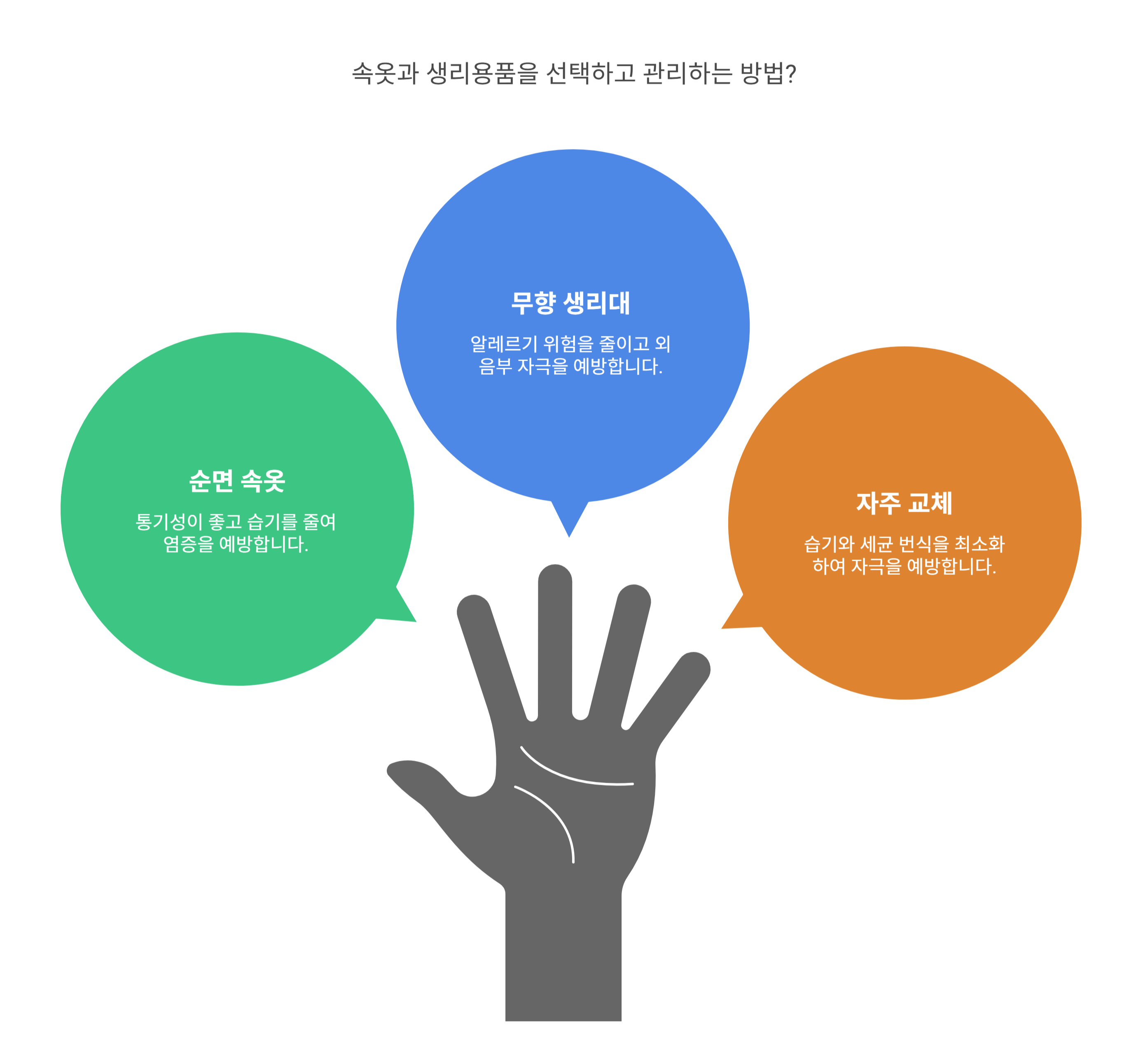 | 팬티라이너 장시간 사용 | 습기, 세균 번식 | 필요 시만 단시간 착용 |
