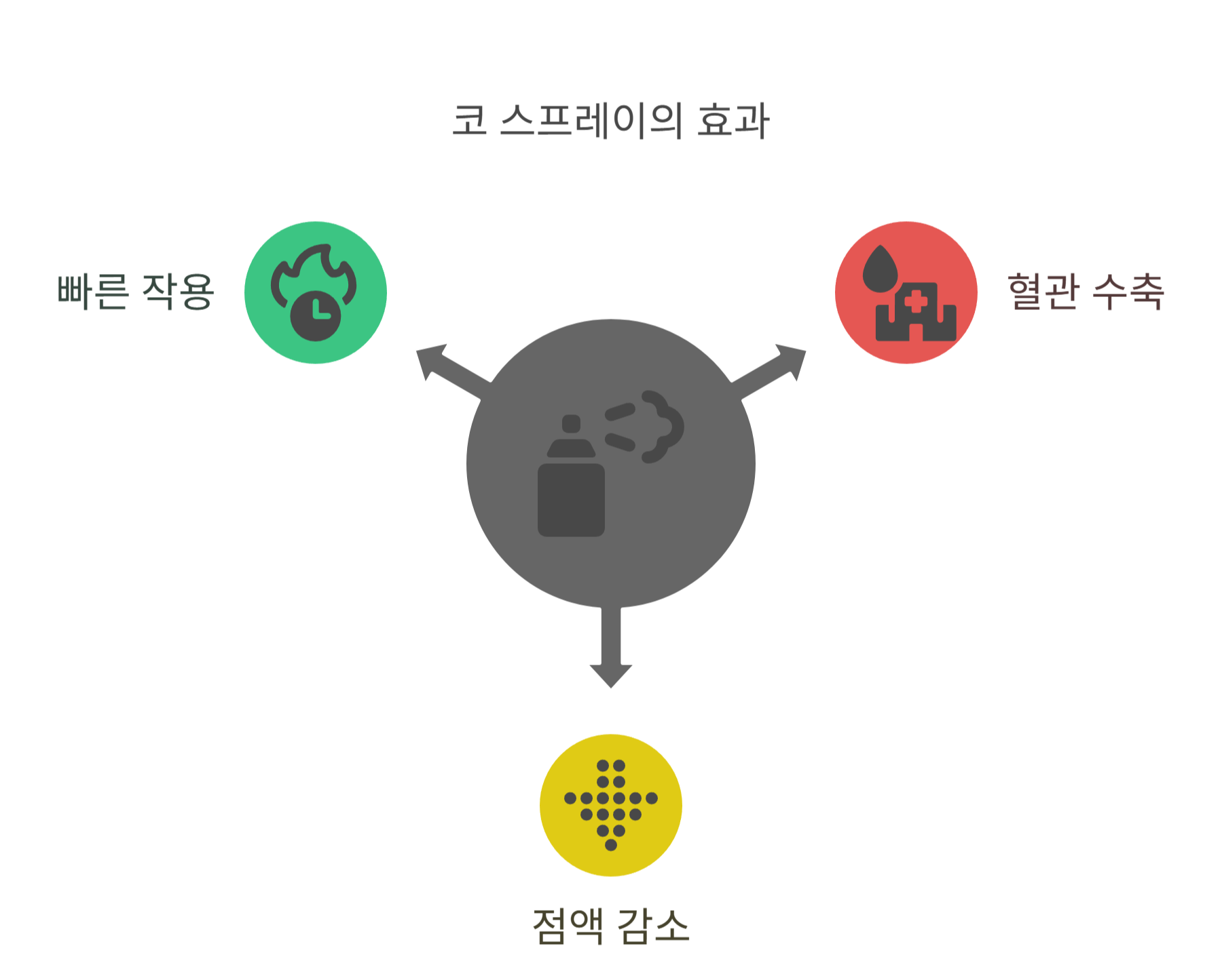 코막힘 원인인 점막 부종과 혈관 확장을 바로잡는 게 코 스프레이의 핵심 작용이에요!
