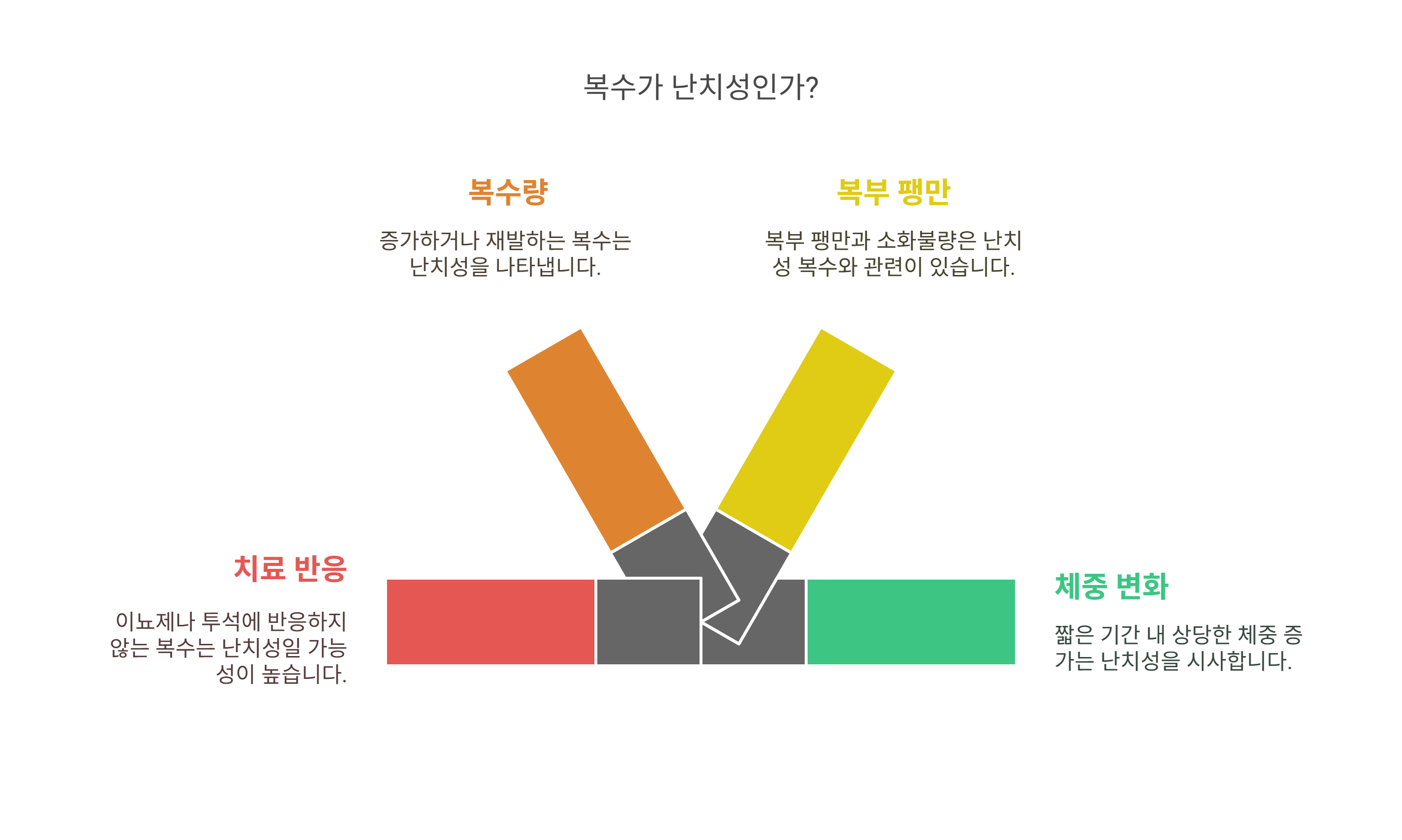 특히 '난치성 복수'는 단순한 체액 이상과는 다른 질환 신호일 수 있기 때문에, 조기에 구별하는 것이 치료의 핵심이에요.