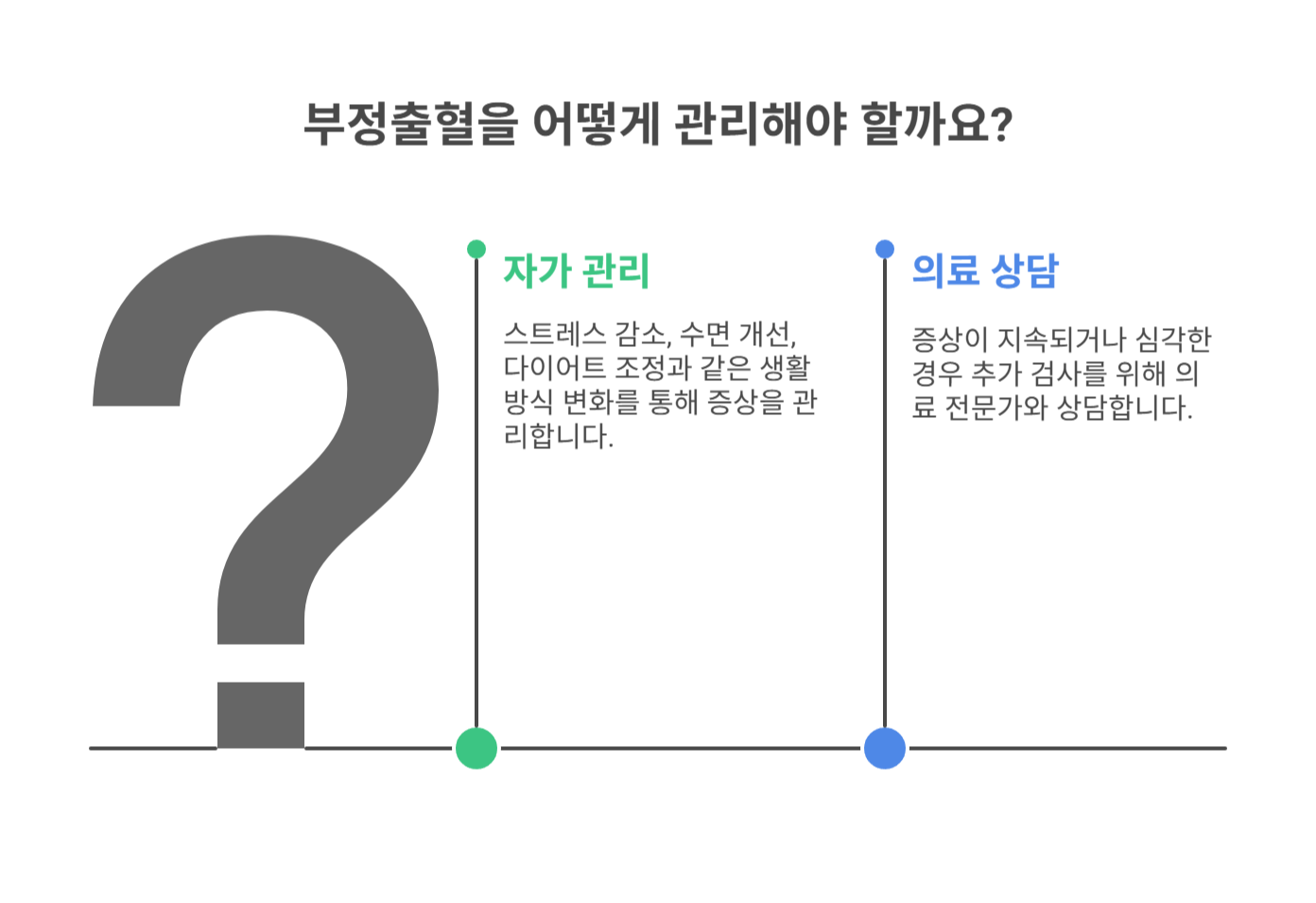 부정출혈은 정상적인 생리 변동일 수도 있지만, 자궁근종, 자궁경부염, 갑상선 질환 등 질환으로 인한 신호일 수 있습니다. 따라서 단순히 "조금 피가 보였으니 괜찮겠지" 하고 넘어가기보다는, 패턴을 기록하고 필요할 때 진료를 받는 것이 중요합니다.