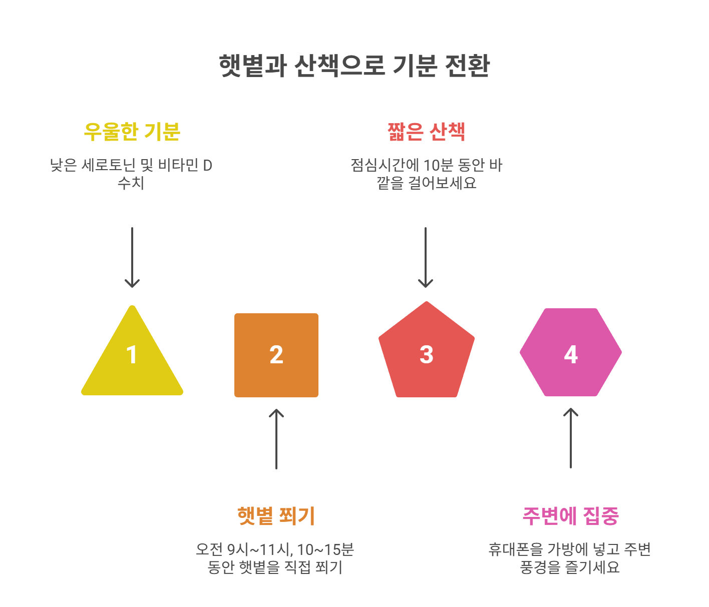 다음은, 짧은 산책과 햇볕 쬐기로 기분을 회복하는 방법을 알려드릴게요! 🚶♀️