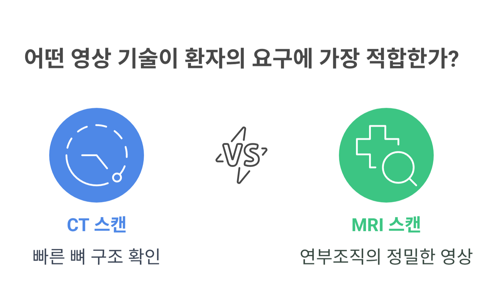 💡 TIP: 금속 임플란트가 있거나 MRI 촬영이 어려운 경우, CT는 대안으로 유용하게 활용될 수 있어요.