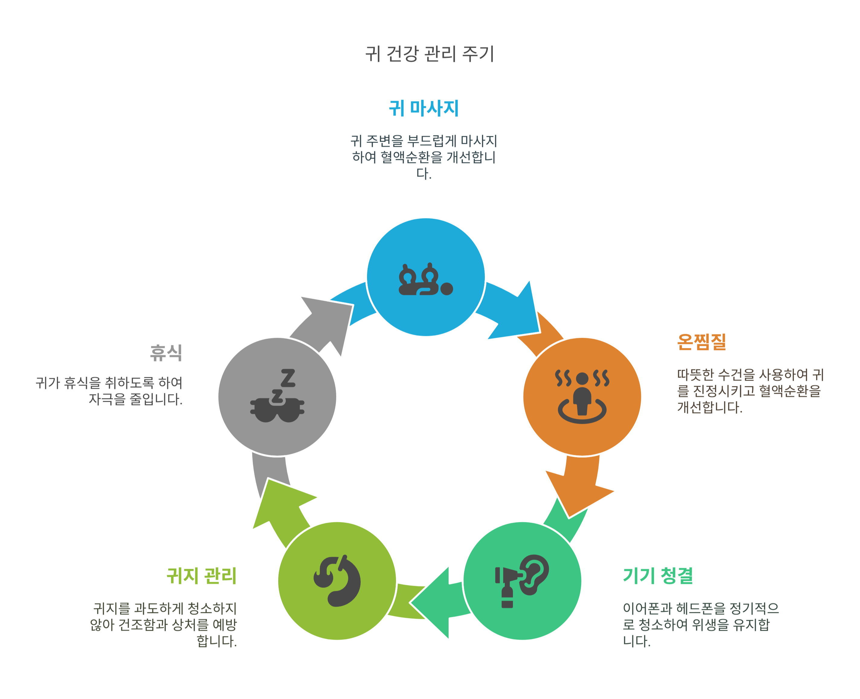 귀는 한 번 손상되면 회복이 어렵기 때문에 작은 습관부터 관리하는 것이 중요해요.