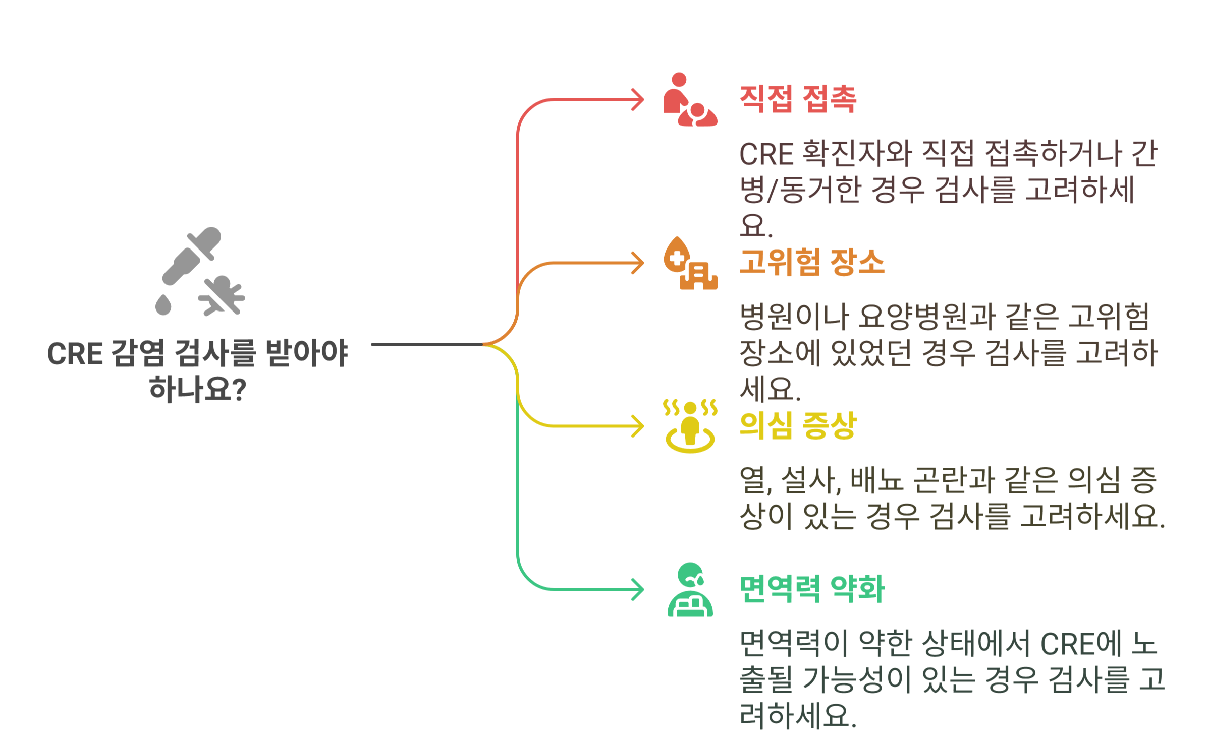 CRE 감염이 걱정된다면, 무작정 병원에 달려가기보다는 검사가 필요한 상황인지 체크해보는 것이 먼저예요.